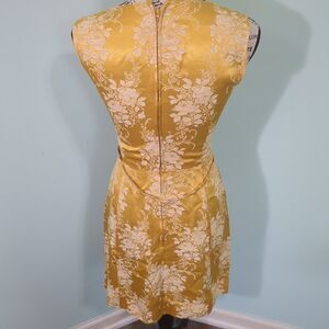 Vintage 1960s 1950s Gold Floral Asian Style lang Dress Full Zip small
