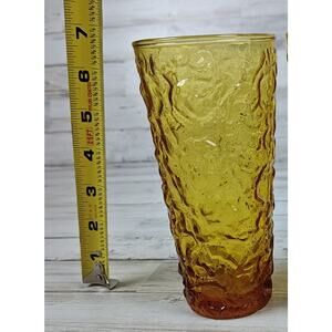 The Vintage 1960s 1970s Anchor Hocking Lido Milano Amber Glass Tumblers Set of 2 is a collectible set of round, crinkle-patterned tumbler glasses manufactured in the 1960s. These glossy finish glasses have a retro charm and are a perfect addition to any vintage-inspired drinkware collection. Made of high-quality glass with a distinctive amber color, these tumblers are a unique and stylish choice for serving beverages in a classic and timeless style.