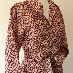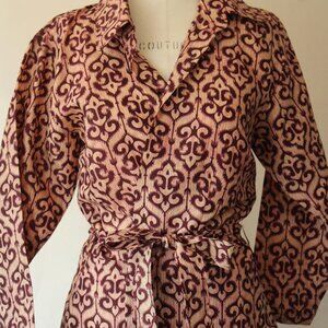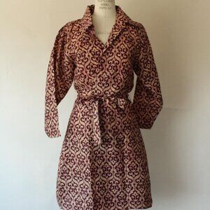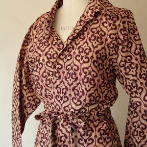 Striking vintage dress from the 1960s or possibly 1970s. Burgundy ethnic batik like print on ivory with a tie belt. Medium sized, I'd say. No label, most likely homemade. Looks and feels like a blend of some sort, its semi stiff