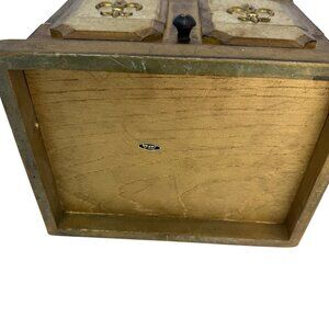 This elegant vintage jewelry box features intricate fleur-de-lis and lion head accents. Its gold and cream tones exude timeless sophistication and charm. Minor scuffs and wear consistent with vintage age. The music box feature does NOT work. 7.25" H x 7.75" W x 5.75" D.