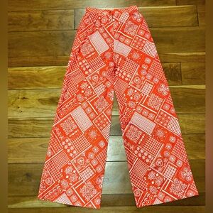 Fabulous Bohemian style true vintage wide leg pants. Orangey red color and white pattern. Flower power to the max. Polyester blend feel material (no material or brand tag). Does have a tag that reads “Lot Size 9”. Zips on the back. Measures approximately 12” flat across waist, 44” length, 33” inseam. Fits like XXS, or around size 0, as there’s no stretch in the material and the waist is not elastic.