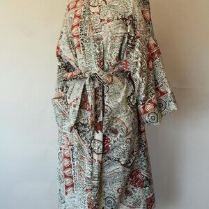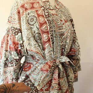 Wonderful vintage terrycloth robe from about the 1960s or 1970s in a kimono style. Has two oversize pockets and a tie that can go at either of two height loops, is lined in yellow terrycloth and is a fun ethnic print of brown and black on off white. Label Reads: Roytex, For Modern Living. Looks and feels like cotton. Was probably a man's originally but really unisex today.