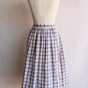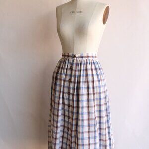 Lovely vintage skirt circa the 1960s or 1970s in shades of brown and blue on off white. Unlined. Buttons up the front. Label reads: none. Its not quite a full circle but close. Probably a larger medium to large. Looks and feels like a cotton or cotton blend.