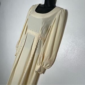 Vintage 1960s 70s Boho Victorian Hippie Feminine Cream Gunne Sax Puff Sleeve Lace Maxi Stretch Dress