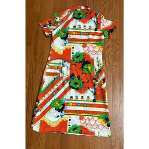 Standout vintage 1960s/70s mod dress with an amazing psychedelic floral + geometric print in orange, green, yellow, blue, and black. Features a classic pointed collar, short sleeves, and an A-line silhouette. Lightweight polyester material — perfect for collectors of true mod fashion or for costume, retro parties, and statement styling.