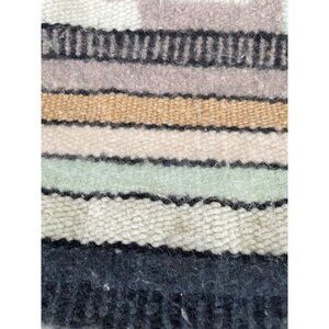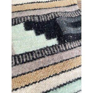 Vintage 1960s Southwestern style saddle blanket rug, finely crafted from alpaca wool. A beautiful addition to your home decor with its rich, natural colors and intricate pattern.This rug has fuzzy parts so I think it is from Alpaca wool. It measures 31x25". It has no stains or holes. There is a little bit of pilling on the fuzzy parts. Overall in very good condition.