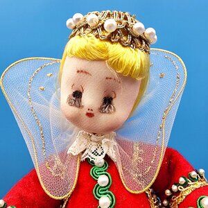 Beautifully handcrafted with attention to detail, she features a red felt gown trimmed in gold, green rickrack, and faux pearl beading. Her yellow hair and stockinette face give her a sweet retro expression, while delicate lace cuffs and gold crown complete the look.