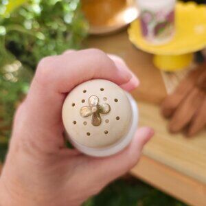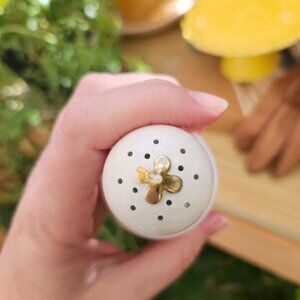 Condition: AS IS vintage condition with typical signs of wear which can include scratches, scuffs, or small chips. Small areas of paint loss noted and the toppers are slightly yellowed and darker than the milk glass bottoms with a chip noted at one of the gold tone tops of the shaker tops. please review detail photos carefully.