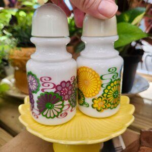 Vintage 1960's Avon Milk Glass Shakers with Colorful Mod Floral Pattern