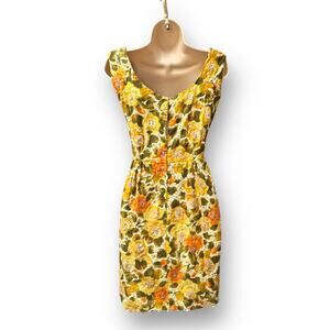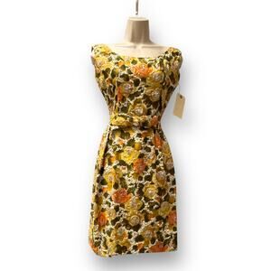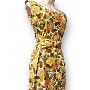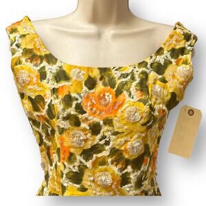 Vintage 1960s Beaded Sequined Silk Floral Wiggle Dress Yellow Orange Green belt