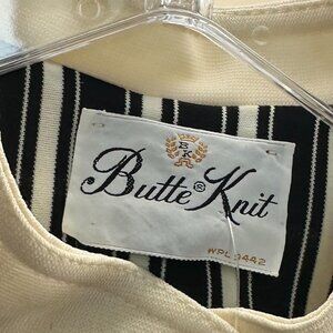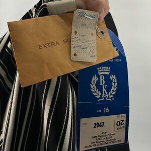 Vintage NWT new with tags, 1960s shirt and pants ensemble, 100% polyester. Mod shirt, black and white stripes, 5 buttons down the front, 1 button and pocket on left breast. 40 inch bust, 38 inch waist. 26 inches top of shoulder to bottom hem. 18 inches armpit to bottom hem. 5 inch side slits on both sides from bottom hem up. Plain black pants with an elastic waistband, no closures. 34 inch waist. 40 inch hip. 46 inches waistband to bottom hem. 34 inches from crotch to bottom hem.