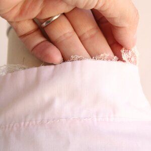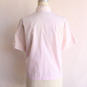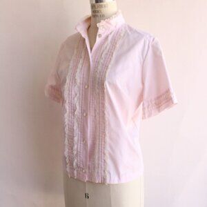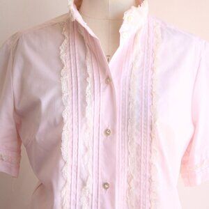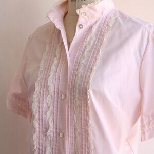 Sweet vintage pink blouse, circa the 1960s or so. Tuxedo front style with ruffled lace and darling nehru-esque collar. Short sleeves. Pearlized buttons up the front. Label reads: none but it does seem like there was one once thats been removed. Probably about a large to extra large. Looks and feels like cotton with nylon trim.