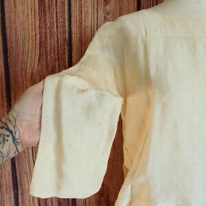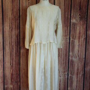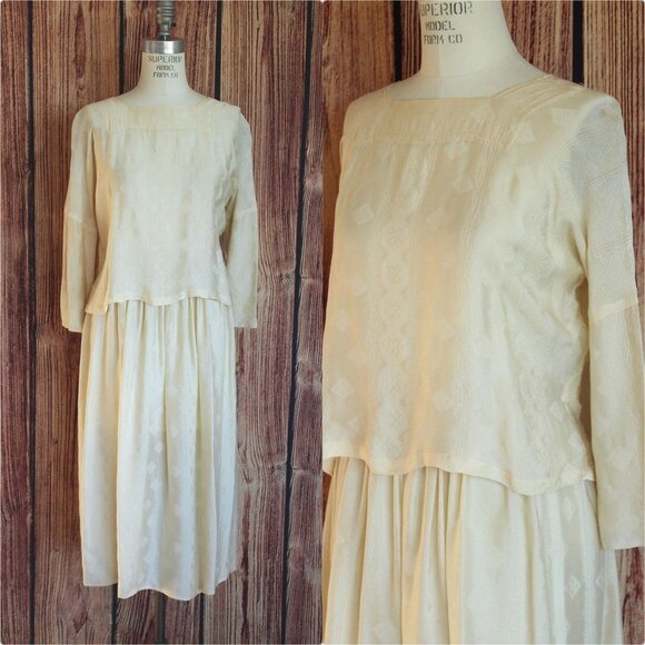 Charming vintage skirt and blouse set circa the 1960s. Ivory silk with an art deco esque pattern. Skirt is full though not a full circle, and has a hook and eye closure and a slit at the bottom in back. Blouse has a square neckline and three quarter sleeves, and has slits at either side. Has a 1920s 1930s feel but I dont believe its that old. Something makes me suspect this was a wedding outfit but it would be a darling everyday look today, and think of all the cute looks one can put together separately. Label reads: none. About a size small to medium but do see measurements below.