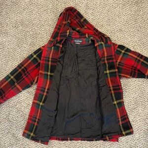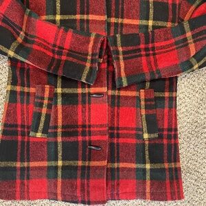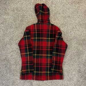 1960's Vintage red and black hooded wool jacket . Excellent condition for the age. Oval button front closure exterior side pockets