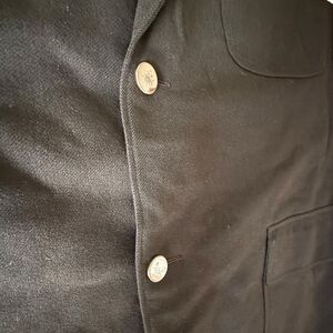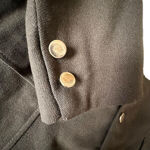 Union made in the USA. No fabric tag but feels like a wool tonic mix. Buttons are tarnished and need replacing, some of the seam at the back has come unstitched please see last pics