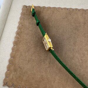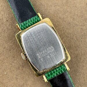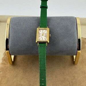 Vintage 1960's Bucherer Ladies Wrist Watch 10 Micron Gold Plating, 1x3/4 inch Rectangle or Tank Shape. Gold Hands and raised Markers, New 8 Inch Speidel Brocaded Green Strap, Stainless Steel Back Original Bucherer 17 Jewel Mechanical Movement