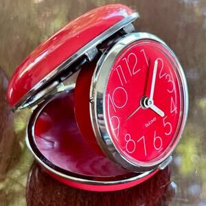 Charming vintage 1960s Bulova travel alarm clock in a vibrant red folding round case. Made in Japan. The face features a bright red background with modern white numerals and hands. Compact and functional with a fold-up design perfect for bedside or travel.