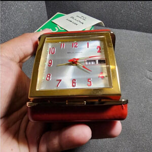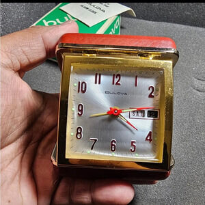 Vintage 1960's Bulova Travel Day & Date Alarm Clock Table Clock Mechanical Wind working in original box and manual see pictures for reference