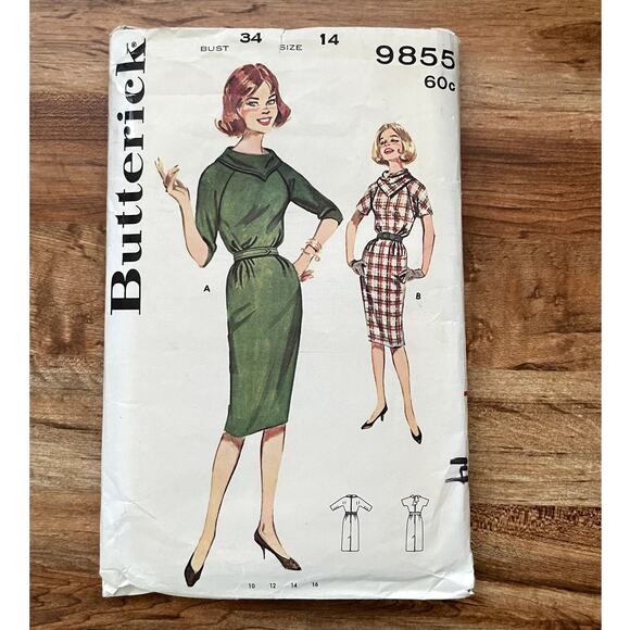 Vintage 1960s Butterick 9855 Sewing Pattern Size 14 Raglan Sleeve Midi Dress COMPLETE