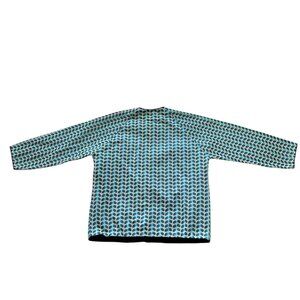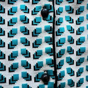 Vintage 1960s sweater, Lady Spear, white with blue and black square / geometric print, high neck, button front, 3/4 sleeve, medium, pit to pit: 18.5", length: 20", discoloration, missing the top button - see photos