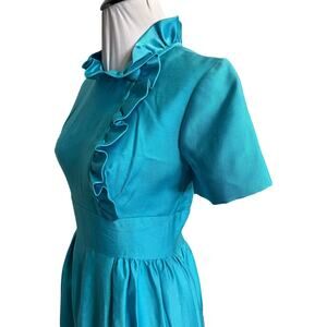 Vintage 1960s Emma Domb Maxi Dress is the richest shade of cerulean blue. The short sleeve and ruffled neckline and bodice details lend itself to a regency period revival inspiration. The fabric is a heavier moire fabric, less the watermarked look. Marked vintage size 7. Womens garment label. Gorgeous gathering at waist. Cap sleeve. Lined.