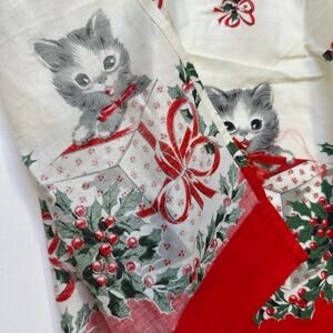 Vintage 1960’s Christmas Apron with Kittens and Holly. Cotton fabric with printed Christmas kittens and holly motif. Small jingle bells sewn onto the ribbon collars. Appears to be handmade. Measures 23” long.