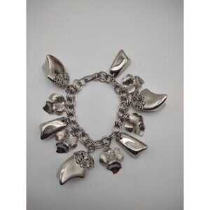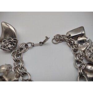 Vintage 1960s Chunky Cha Cha Silver Tone Charm Bracelet. Featuring Filigree, Nuggets and Maple Leaves.