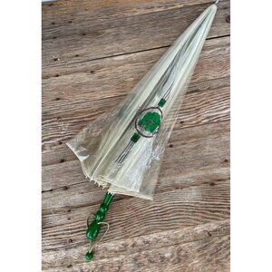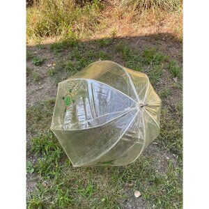 Stand out in the rain with this vintage 1960s clear vinyl bubble umbrella. Adorned with green flowers and featuring a matching handle, this chic accessory is perfect for those who love retro style. This umbrella has a few flaws. The pole is slightly bent but it is functional. One spot on the seam is separating and it is very small. I did wipe this down but could use a more detailed cleaning. . It is overall in good shape and great for photo shoots.
