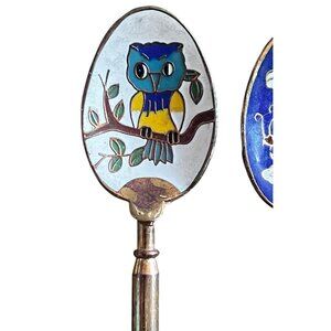 These vintage 1960s cloisonné enamel spoons feature intricate animal and floral motifs. Crafted with precision, they showcase vibrant colors, highlighting their artistic and collectible appeal.