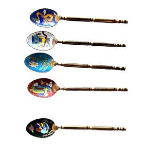 Vintage 1960s Cloisonné Enamel Decorative Spoons Set Of 5 Animal & Floral Design