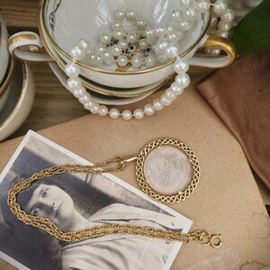 Vintage 1960's Crown Trifari reverse intaglio glass Scorpio zodiac pendant. Fabulous 60's glass engraved pendant featuring astrological zodiac sign Scorpio sign, a scorpion, with flowers. Set into a gold tone scalloped edged pendant. On gold tone chain.