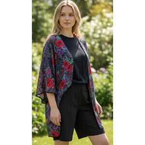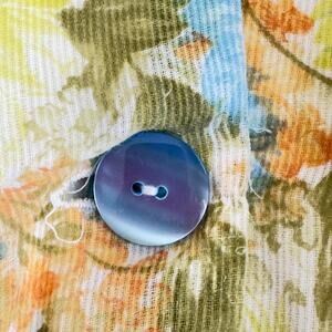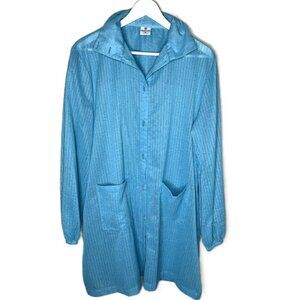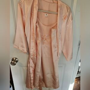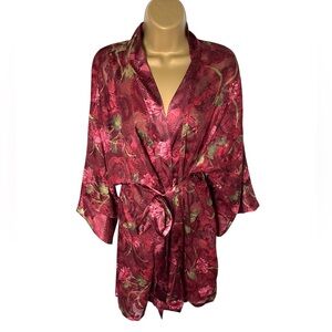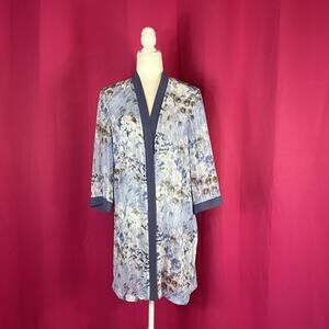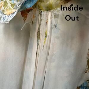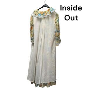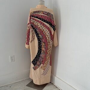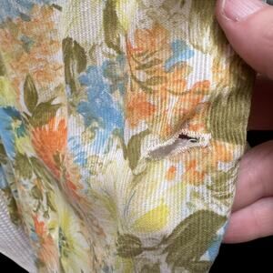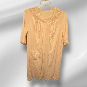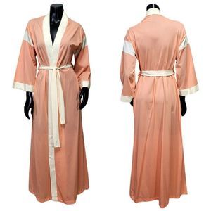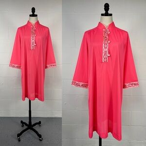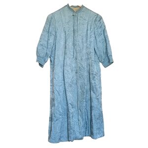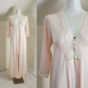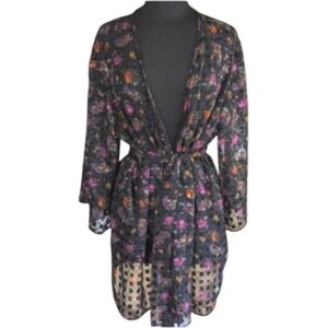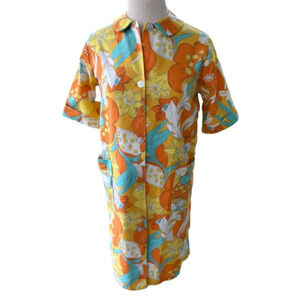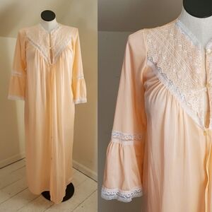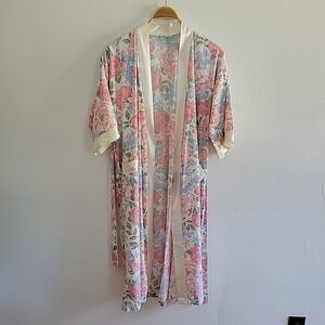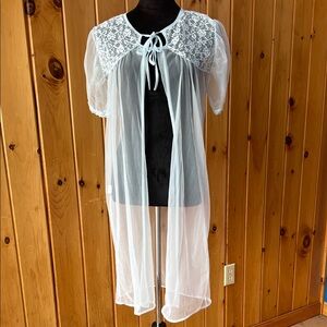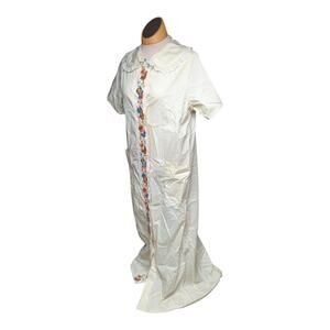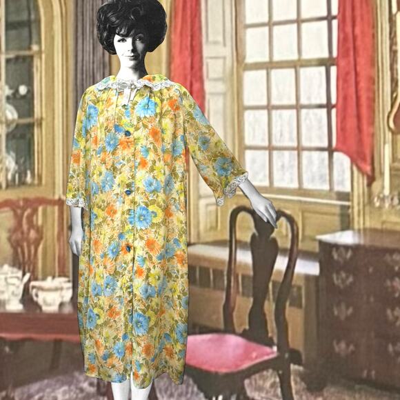 Lightweight 1960s floral robe or housecoat from CRC wardrobe stock. Button front with a tie at the neck and lace trim. Unlabeled.