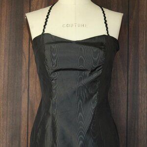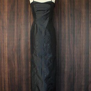 Sleek vintage dress from the 1960s in what feels like black moire taffeta. Wiggle shape and full lenth with sequin spaghetti straps. No label. I'd say small to medium size but do see measurements below. Zipper up the back ( it does zip all the way, but it was a bit too tight on my dress form.) Appears homemade.
