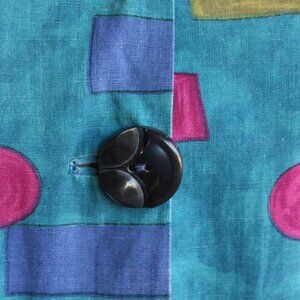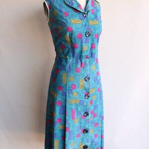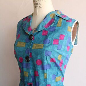 Charming vintage 1960s dress in blue cotton with a pattern of geometric shapes in a variety of colors. Rounded collar, shirtwaist style with buttons ll up the front. Lightly full skirt. Volup size, see measurements. Label reads: none