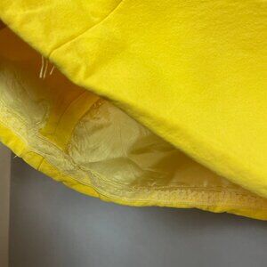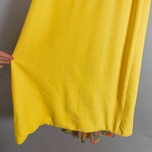 Vintage handmade vintage crepe yellow dress with bow and semi-sheer floral train. Bow snaps into place with a hidden zipper beneath. Sleeveless with square neckline. Empire waist. Note that train hangs below the hem of the dress.