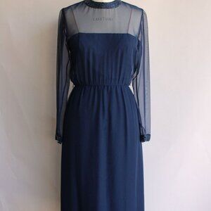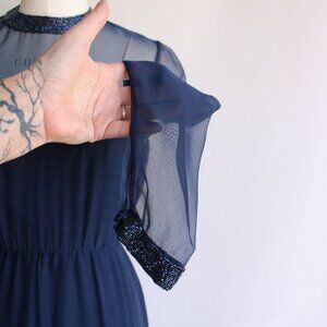 Just gorgeous vintage navy blue cocktail dress from the 1960s. sheer chiffon over an opaque bottom layer. The neckline and sleeves are unlined and transparent. There is a gorgeous, beaded collar which is echoed at the bottom hem and the sleeve ends. There are snaps at the ends of the sleeves for a bracelet fit. It is poly. Label reads: Victoria Royal, Made in Hong Kong, an gives a size of 6, but do see measurements below as vintage sizing differs from modern.