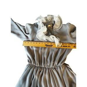 Keywords: Vintage dress, Emma Domb, Gray dress, Ruffle collar, Long sleeve dress, Cocktail dress, Party dress, Vintage fashion, Retro dress, Elegant dress, Classic dress, Women's dress, Fitted waist