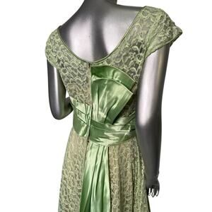Vintage 1960s Emma Domb Green Lace evening gown. Nude/being acetate liner under the lace. Short sleeves and satin cummerbund style waist with double half bow back sash that trails town the back of the skirt. Full skirt to swish and dance the night away in.