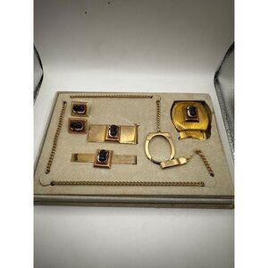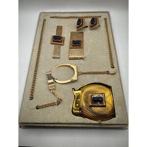 Vintage Evan men's accessories collection, in its original box (box does show wear). The set includes a lighter, tie clip, money clip, cuff links, key ring with chain, and the box.