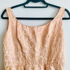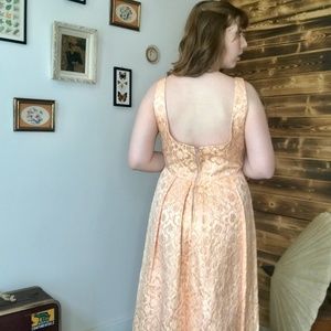 Vintage 1960s dress in a beautiful pastel pink and yellow, with light floral design. Zipper in the back, and lined inside. Scoop neck in the back.