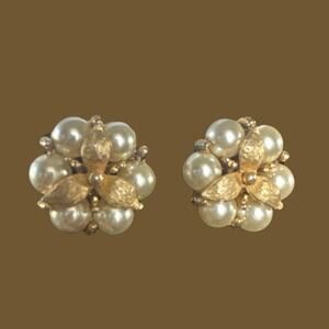 These vintage 1960s faux pearl cluster clip-on earrings, measuring 1 inch, are in very good vintage condition! Featuring luminous faux pearls accented by gold-toned textured leaves, they are perfect for any vintage jewelry collector or fashion enthusiast.