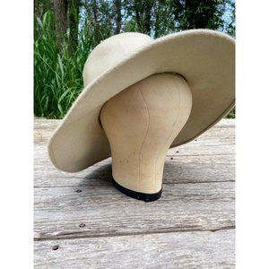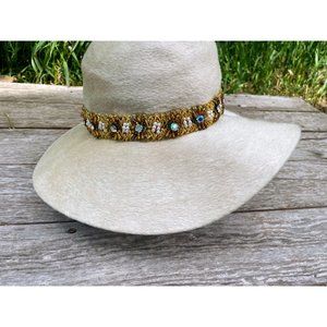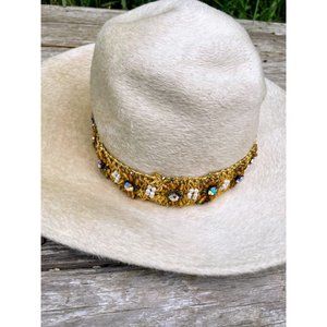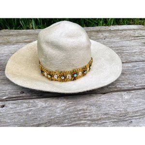 Here for your consideration is a nice vintage felted wool bucket hat. The band is nice and full of rhinestones and pearls. The brand is Jan Leslie and the wool is Helios and made in Italy. The circumference on the inside band is about 20". This hat is in very good condition. It is clean and free of holes.