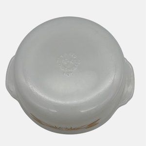 Pair of vintage Anchor Hocking Fire King round cake plates in the Wheat pattern. One is the 7" deep cake pan which measures 8.75" across from handle to handle. The other is the 8" round cake pan which measures 10" from handle to handle. The Wheat pattern is white milk glass with a yellow and gray wheat design. It was made from 1962 to 1966 and is now discontinued.