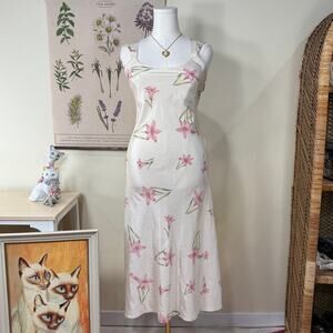 Flamingo pink vintage slip dress with dreamy lace trim, a layered bodice, and soft coquette fairycore vibes.