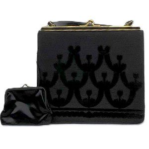 Black silk exterior is soft with flocked tulip flower design on both front and back. Gilt textured spring clasp and strap rings. Satin lined interior. Slip pockets inside, one is zippered. Attached kiss lock coin pouch included.