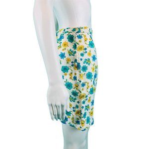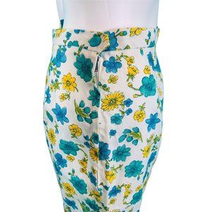 A pair of vintage 1960s shorts in white with blue/yellow/green floral print, with a high waist and slim legs. Shorts zip up the side with a metal zipper and a button closure on the waist.