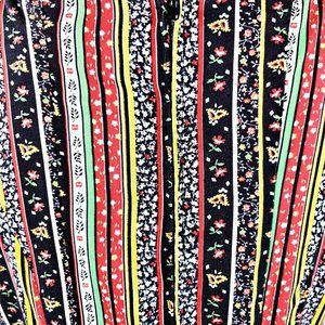 Calico Country Cuteness. Perfect prairie puff dress w full circle skirt to twirl. Stripe calico in bright colors w flowers. Lace at front yoke & hem ruffle. Puff sleeves. Cotton weave belt in yellow. Stripes diagonal to center. Wear w BOHO sandals or cowgirl boots.