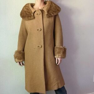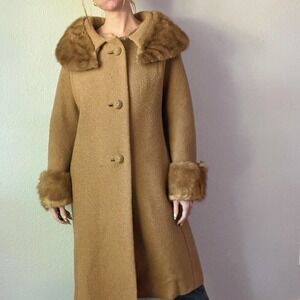 Vintage 1960's Forstmann Frizelda Tan Boucle Wool Fur Trim Swing Coat
