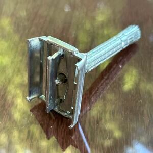 Vintage 1960s Gillette Super Speed safety razor. Measures 3 1/2 inches in length and 1 5/8 inches in width. Twist the bottom to slowly open and close the top of the razor. Well-crafted, durable, and perfect for daily shaving or adding to your vintage grooming collection.