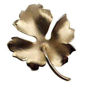 Elegant vintage 1960s Giovanni gold-tone leaf brooch featuring a beautifully sculpted, textured surface with softly curved edges that capture light from every angle. This nature-inspired design reflects the organic, naturalistic motifs that defined mid-century jewelry artistry.